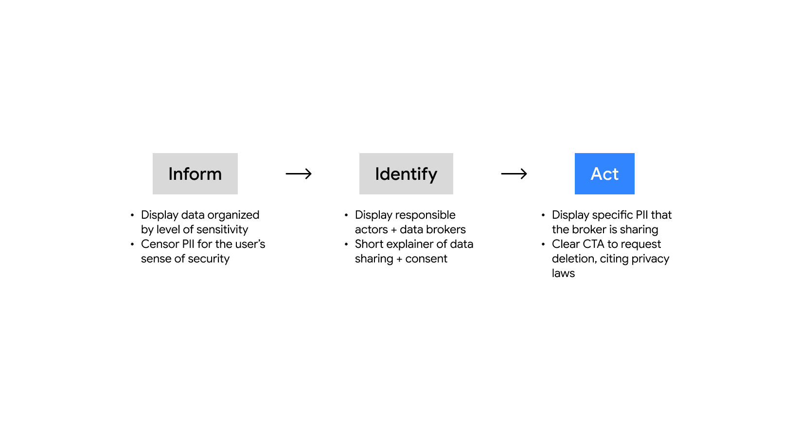 Showing someone their data is being sold can easily trigger user anxiety. I facilitated six focus group sessions to design an experience that both informs and empowers, surfacing exactly which data points are at risk while giving clear, actionable steps to remediate. The design had to follow a clear logic framework: calmly inform, responsibly identify, and streamline action.