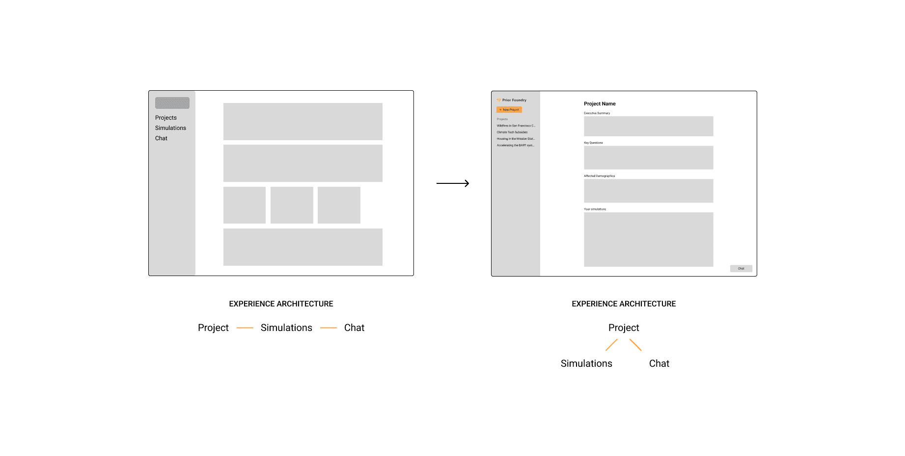 The original architecture separated three features into distinct areas of the product: Projects, Simulations, and Chat. Users kept getting lost and had difficulty understanding the product.