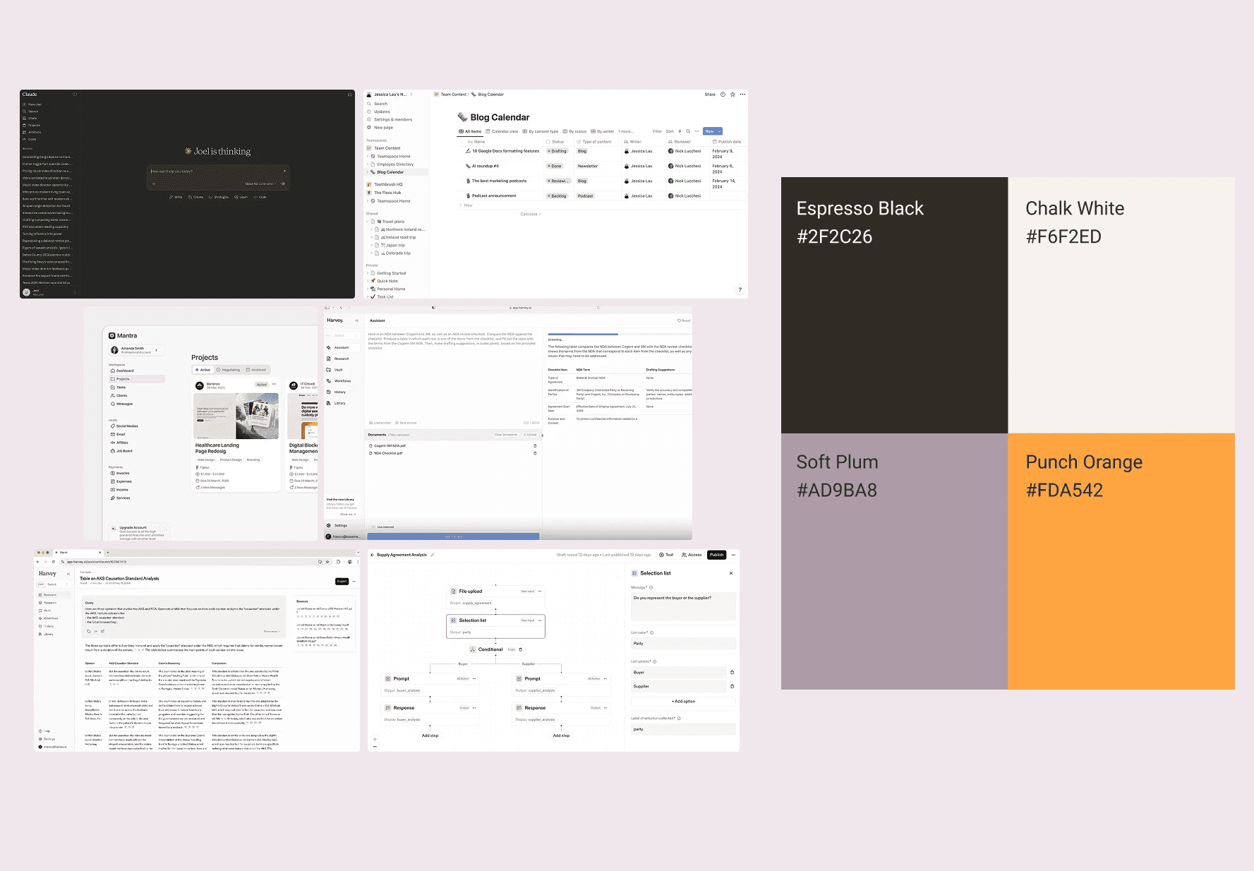 The product's users are expert analysts, meaning the interface needed to feel like a trustworthy peer. I designed a restrained, high-clarity visual system that matched the software our users were already using like Notion and Harvey: minimal color, sharp typographic hierarchy, and deliberate whitespace. The goal was a product that felt human and credible in rooms where PowerPoint decks and PDFs are the status quo.