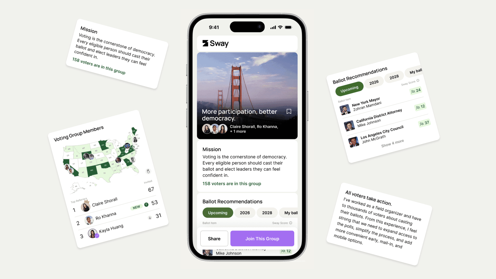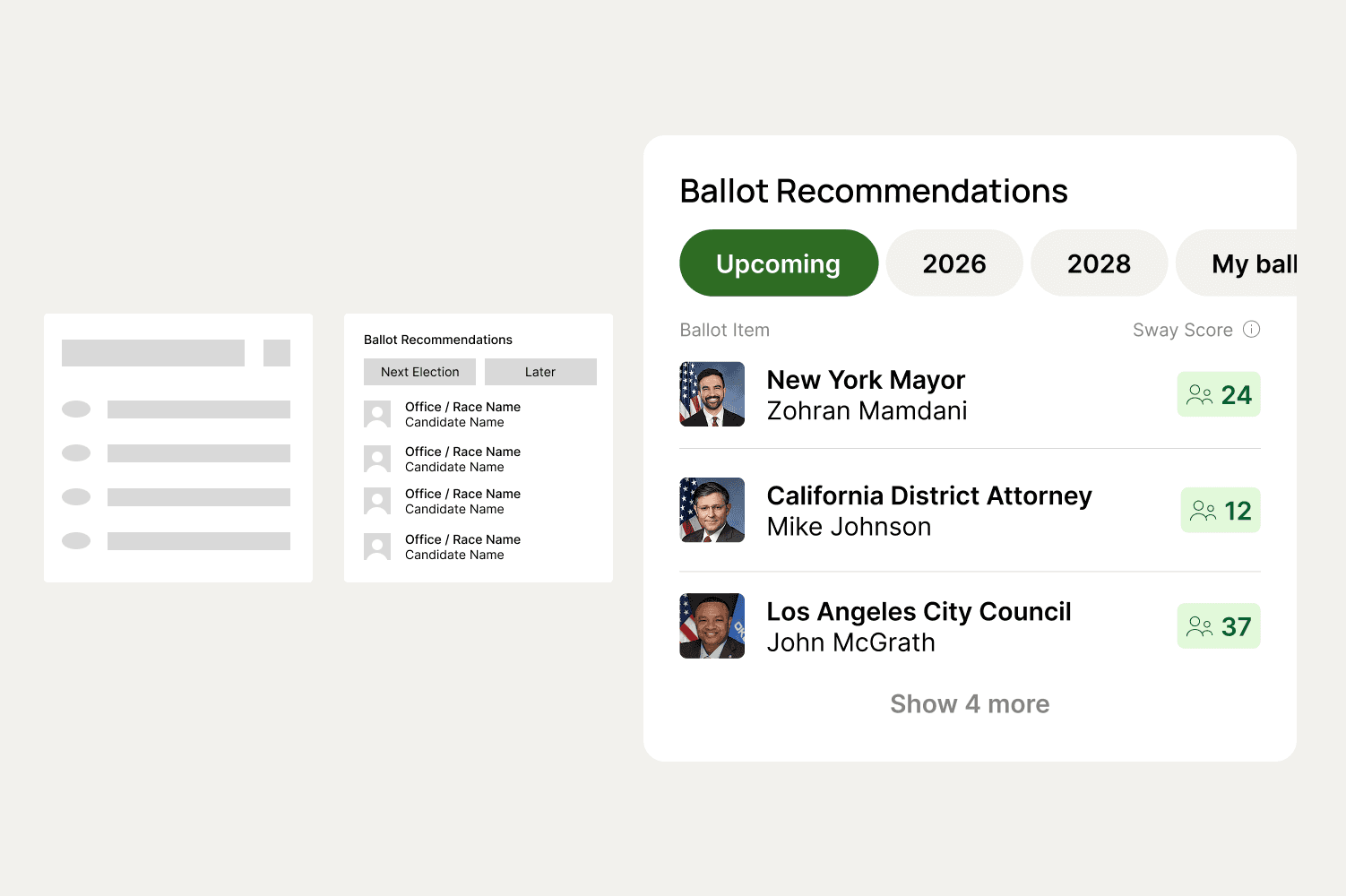 Early usage and dropoff rates showed that visitors didn't understand what Sway was. I rigorously tested with focus groups and developed the design of the Ballot Recommendations module to clearly communicate Sway as a voter guide product. Additionally, I strategically moved the module to be above the fold to reduce friction for a user to "get it". After its implementation, comprehension and engagement jumped.